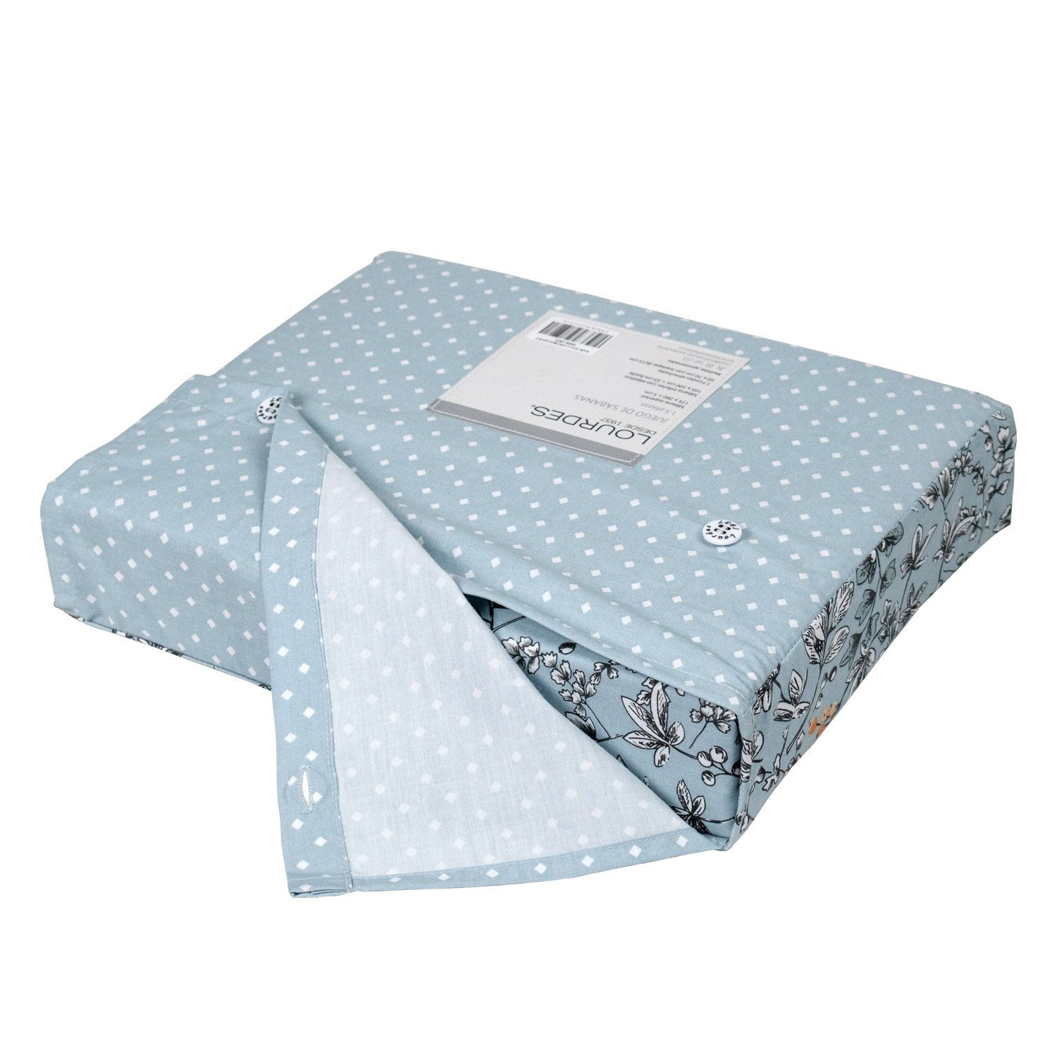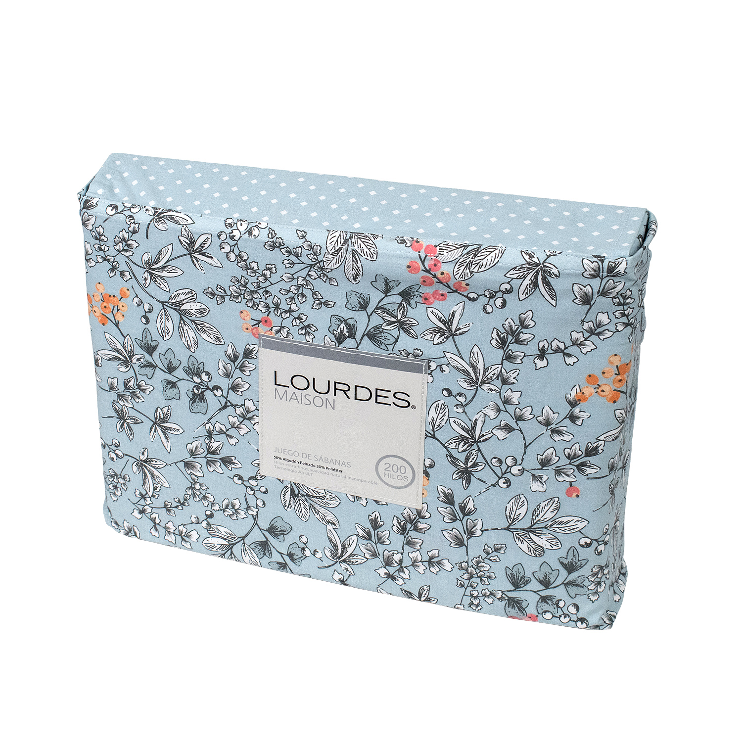 Juego de Sábanas estampadas Lourdes Maison 200 hilos. Confeccionados en telares con tecnología Air-JET, hilado fino. Por lo que se logra esta tela de excelente calidad, suavidad incomparable al tacto.